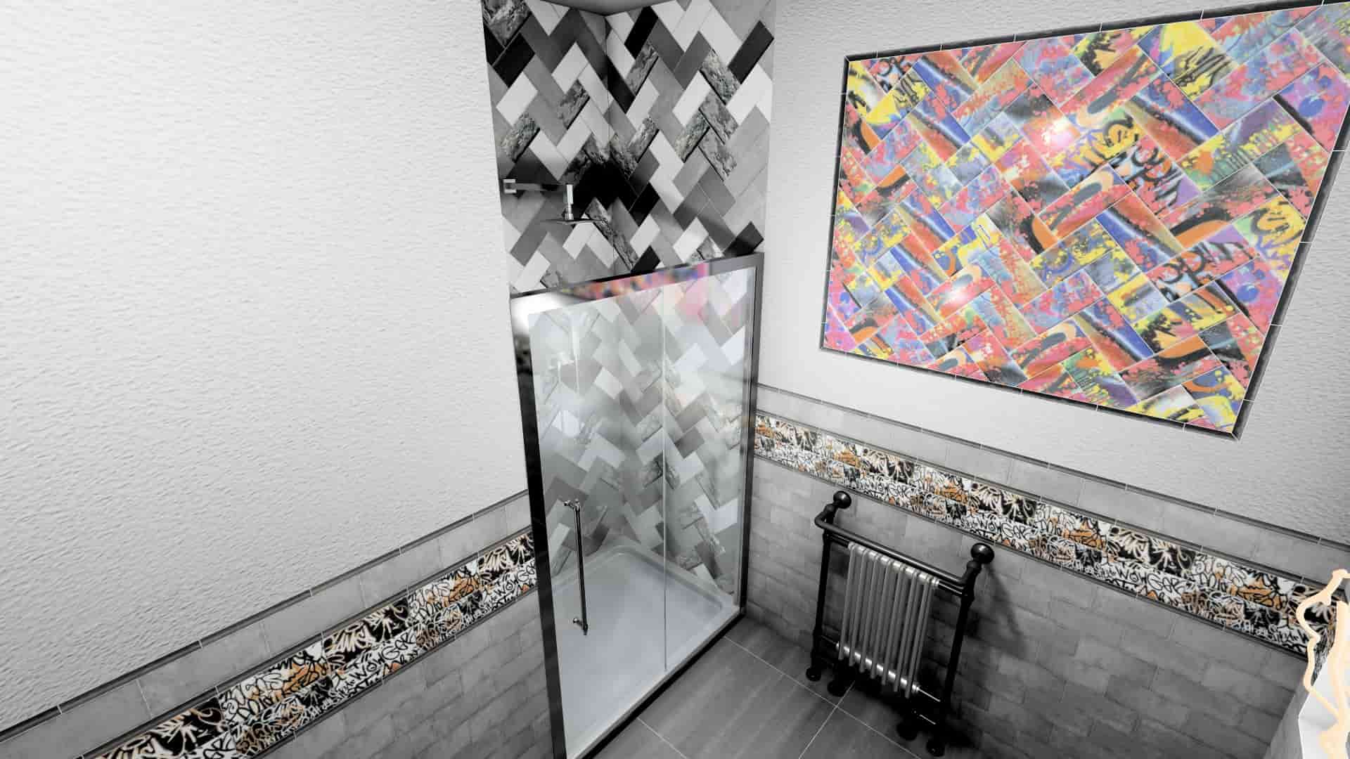 Это проект санузла в стиле лофт с душевой кабиной и раковиной. Стены облицованы смелой и яркой плиткой серии Граффити, название которой говорит само за себя.