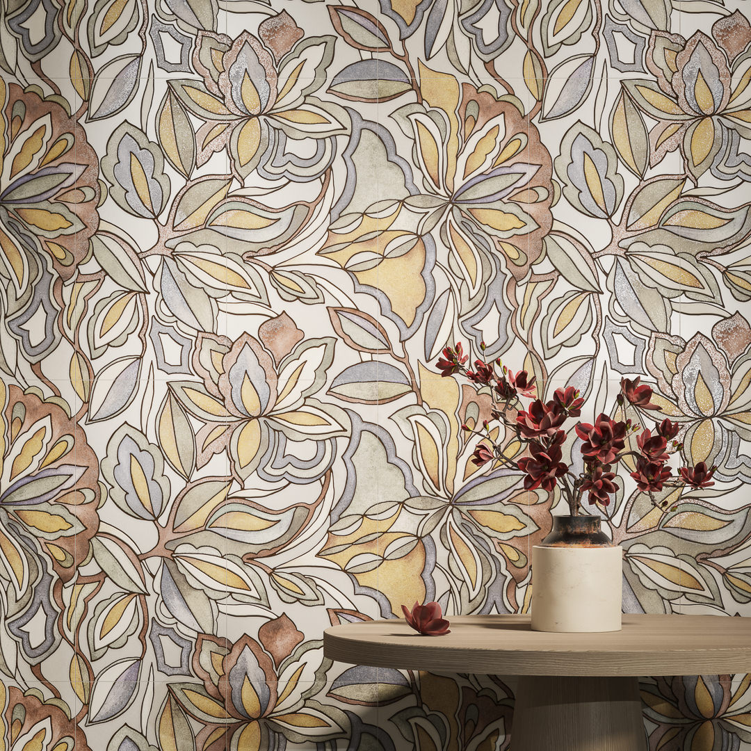 Крупный цветочный орнамент – в основе этого панно, состоящего из трёх частей формата 30х60. Фиолетовые, зелёные и терракотовые тона сочетаются с плавными линиями, создавая ощущение ритма и живой пластики. Части панно стыкуются по горизонтали и вертикали, формируя цельное изображение нужного размера.