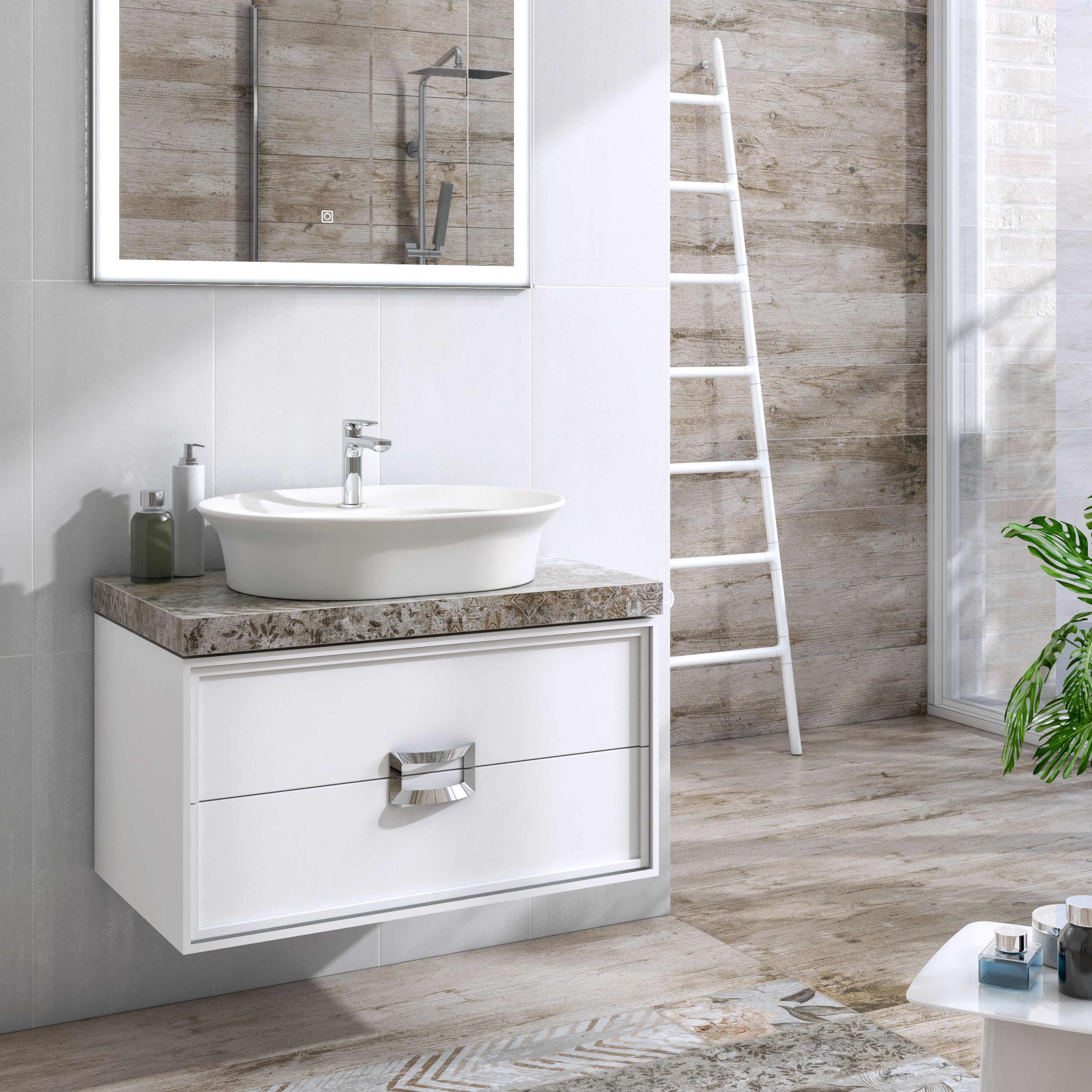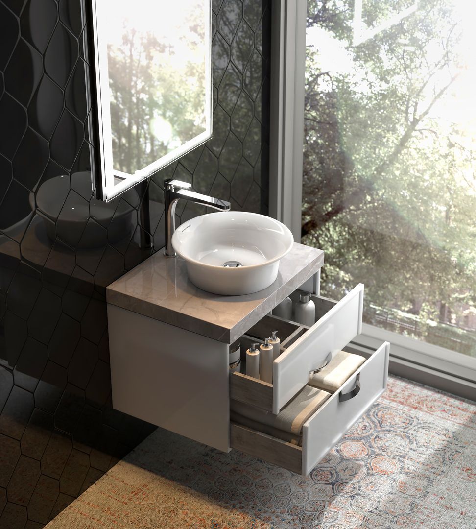 В коллекцию Каналетто входят накладные раковины в трех размерах: 60 см с отверстием для смесителя, а также 40 и 65 см для столешницы с высоким смесителем. Форма раковин с тонкими, слегка загнутыми бортиками напоминает изгибы традиционного венецианского стекла. Навесные тумбы Каналетто представлены в трех размерах — 60, 80 и 100 см. Ящики и дверцы закрываются плавно и бесшумно вне зависимости от приложенного усилия. Тумба Каналетто также великолепно подходит для раковин Бонджорно.