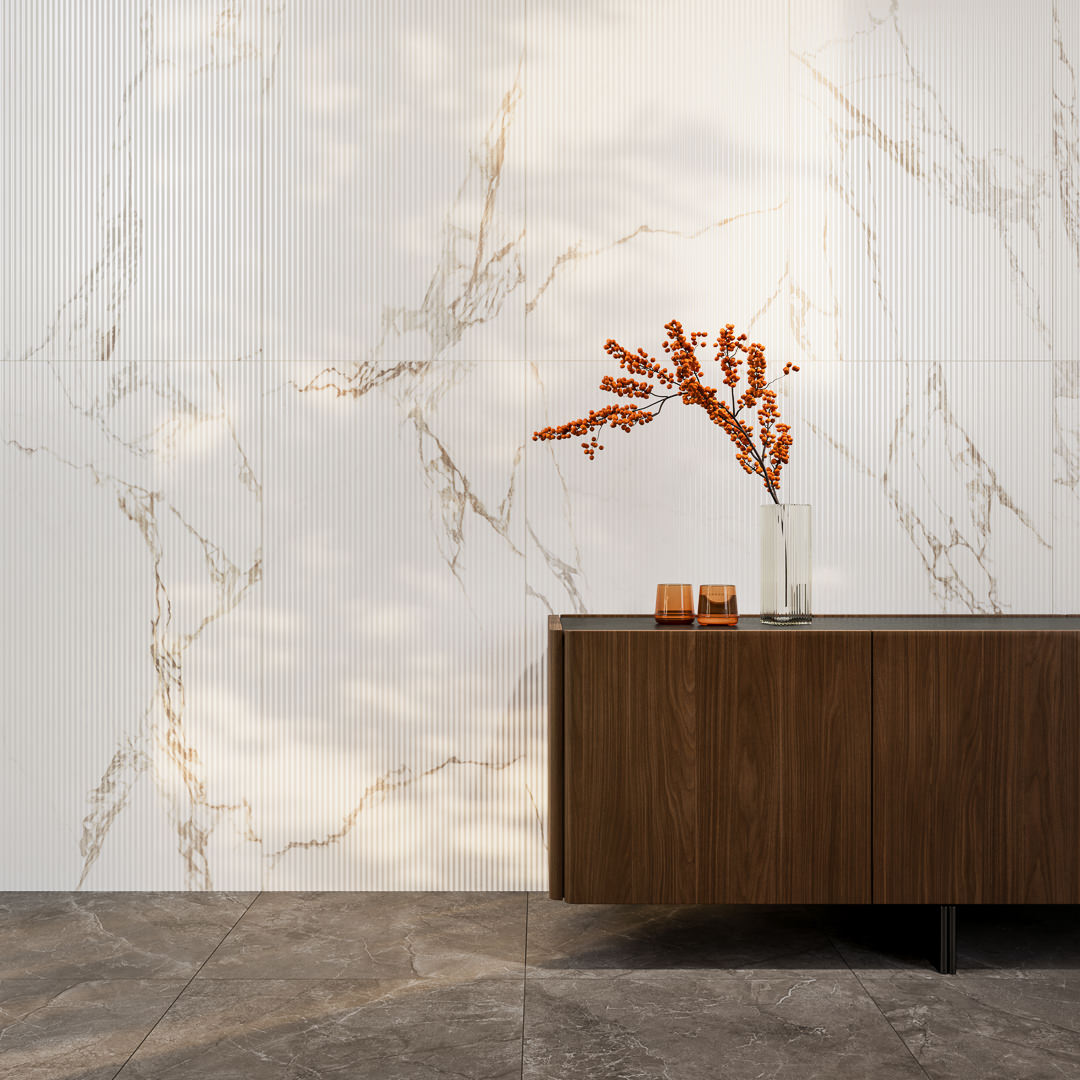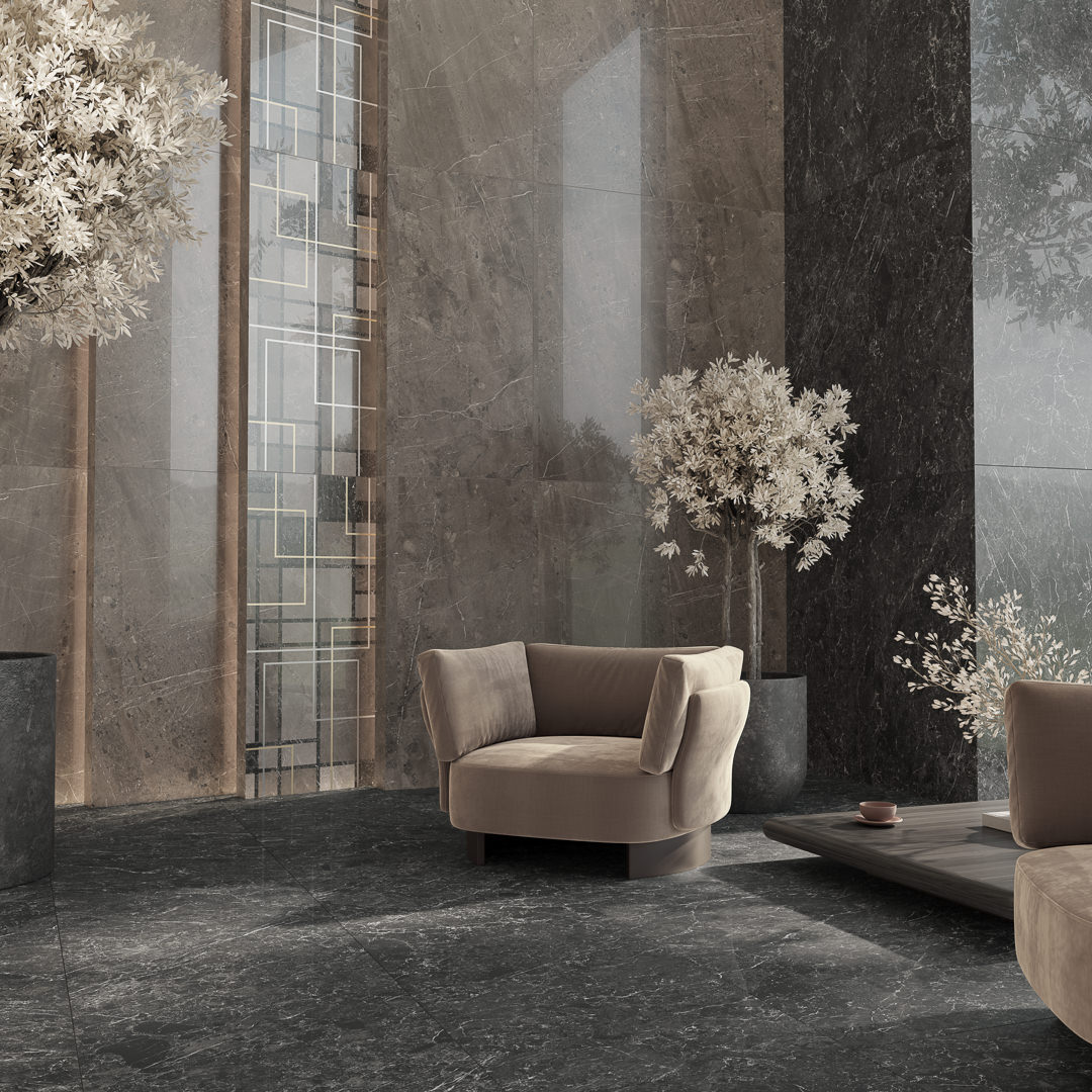 Настенная плитка в формате 60х119,5 предлагается в нескольких вариантах: светлые рисунки мрамора на гладкой плитке, светлые артикулы со структурой рейки и тёмные рисунки мрамора с гладкой поверхностью. Декор 60х119,5 предлагает стильный микс из трёх темных рисунков, помогая объединить в интерьере все три воспроизведения.