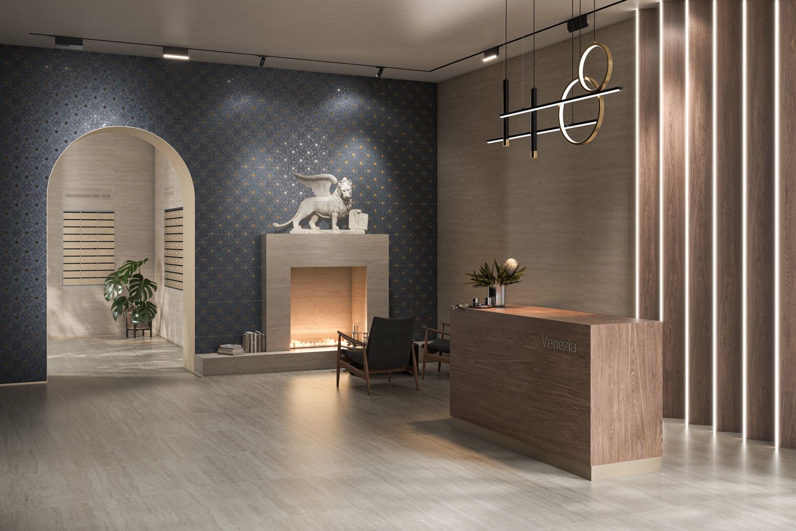 Серия «Сан-Марко» воспроизводит красоту травертина, предлагая природные текстуры и геометрические узоры в натуральных оттенках. Фоновая плитка 40х80 выполнена со структурой камня.