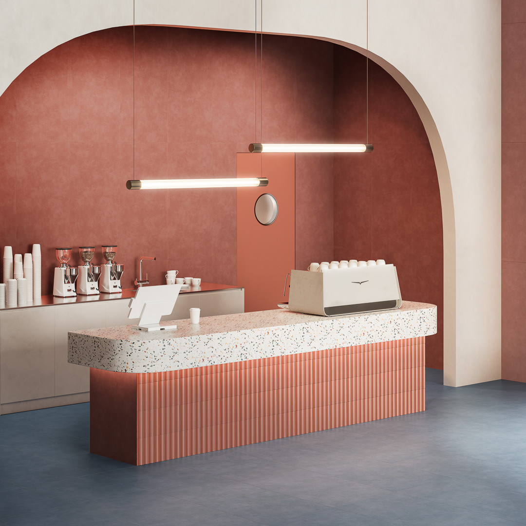Сферу применения керамогранита «Про Чементо» расширяет наличие в серии орнаментальных декоров, мозаики и дополнительных архитектурных элементов: ступеней, плинтусов и подступёнков в тон основному покрытию.